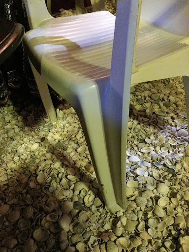 My first meal here was at the local restaurant in my neighborhood; the landlady’s sons walked us their and found owner’s son (who could speak English) to seat us and take our order. A lot of the furniture I have seen, including the kitchen set in my flat, is lawn furniture. The tables were fairly low to the ground, and most people were sitting on lawn chairs in stacks of 2. They did this because aside from the concrete walkway, the entire floor of the restaurant was covered in seashells!